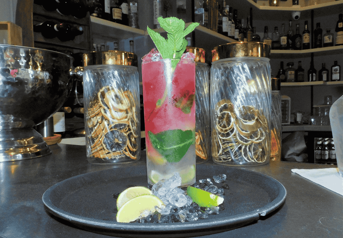 Gin, Lime, Simple Syrup, Bitters, Mint